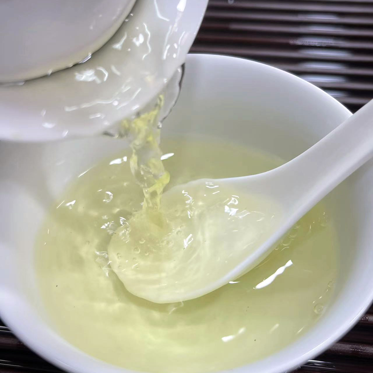 - Снова залить воду и настаивать 5–10 секунд. Немедленно перелить весь настой через ситечко в чахай, а оттуда разлить по пиалам.